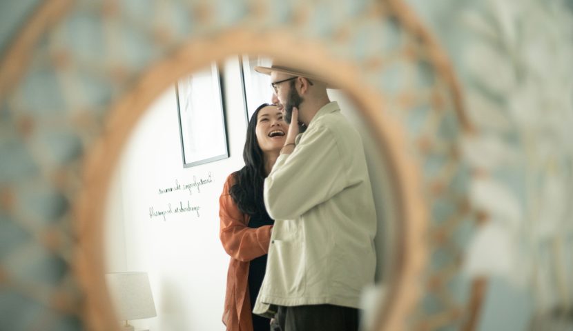 窓からやわらかな自然光が差し込むマンションの一室で特別な演出はせず、二人の自然な会話や仕草、距離感を大切に撮影します。